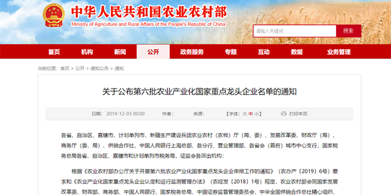 12月3日,农业农村部、国家发展改革委、财政部、商务部、中国人民银行、国家税务总局、中国证券监督管理委员会、中华全国供销合作总社联合印发通知,公布第六批 299 家农业产业化国家重点龙头企业名单,龙江开云手机平台-开云(中国)公司榜上有名。